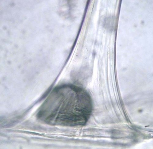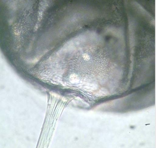 “Hoa” nhìn tổng thể qua lăng kính hiển vi có độ phóng đại 400 lần. Ảnh này cho thấy hoa có hình dáng như bông hoa sen chưa nở với chóp nhọn phía trên.