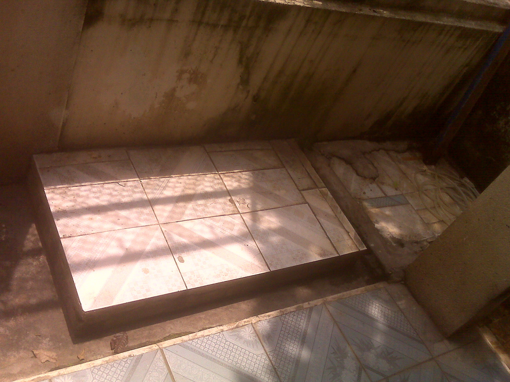 2 là trước nhà, không tính đến cái bể xi măng che cái giếng khoan nằm 1 bên cổng nhà thì phía bên kia có 1 cái….chả biết gọi là cái gì, là 1 tấm bê tông nằm lồi lên giữa thềm nhà nhìn rất vô lý, trên đó cũng được lát gạch men đàng hoàng. Nhìn có vẻ như là 1 cái miệng hố bị đậy vậy. Em có chụp hình lại 2 nghi vấn mới này.