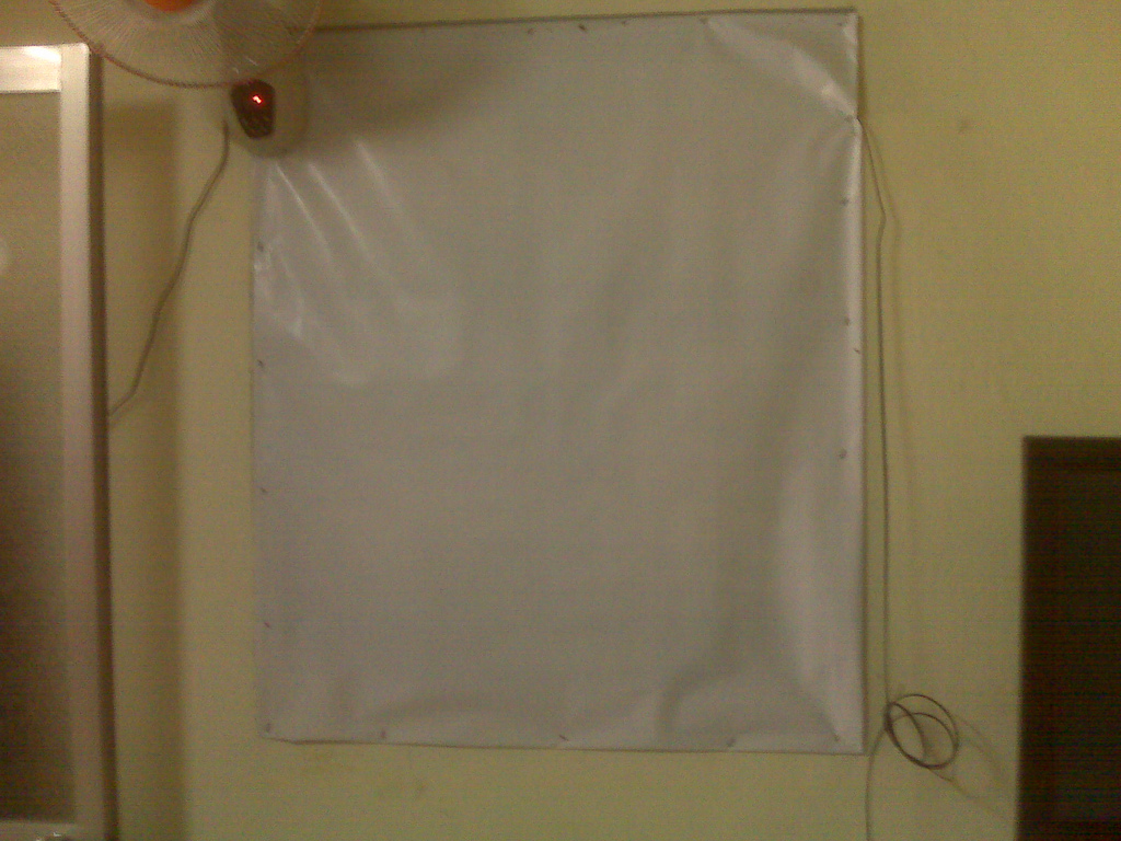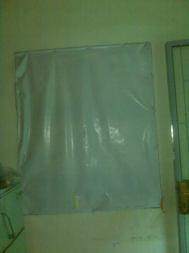 Tấm bạt trắng đóng đinh xung quanh, che kín cửa sổ (gian kế bếp)