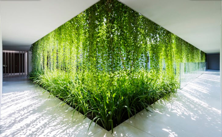 Đằng sau lớp vảy trắng thứ nhất là hệ thống thảm thực vật thẳng đứng xanh rì ở đằng sau. Không chỉ tăng thêm tính thẩm mỹ cho ngôi nhà là vườn treo thẳng đứng còn làm giảm tiếng ồn, thanh lọc không khí và điều chỉnh nhiệt độ trong nhà.