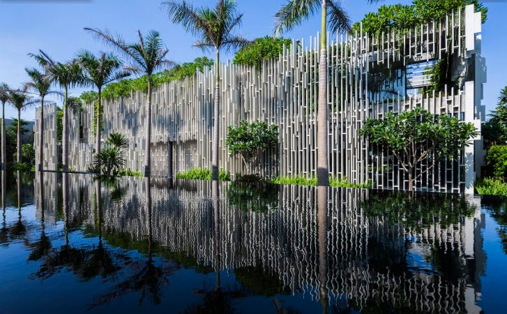 Bên ngoài của khu nghỉ mát hiện đại này là một lớp thiết kế tường đặc biệt để phù hợp với khí hậu nhiệt đới ở Đà Nẵng – một thành phố phải chống chội với mùa hè nắng nóng và độ ẩm cao quanh năm. Theo đó, lớp tường ngoài màu trắng được xây dựng theo dạng xếp lớp vảy tạo nên những ô tản nhiệt. Qua đó, không khí bên trong và bên ngoài luôn được trao đổi qua lại trong suốt cả ngày.